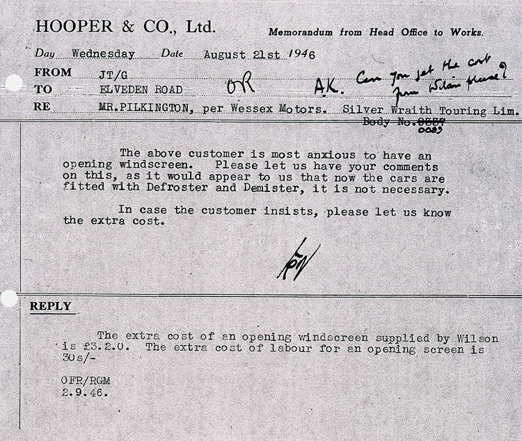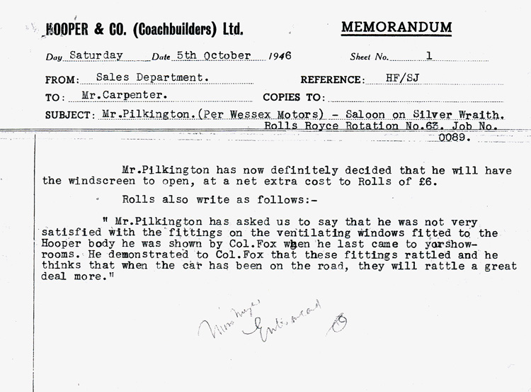 the leather. The car's exterior was to be solid black "all over". A special feature requested by Mr. Pilkington is a ventilating front screen to open, hinged at top. Also, all windows need to be "free from rattle." These types of windows had not been produced since before the War, but Mr. Pilkington was insistent, and got his way. See letter and drawings from Hooper. Another modification was made to the cubby door, see letter. The walnut Golden Burls was to be as light as possible.