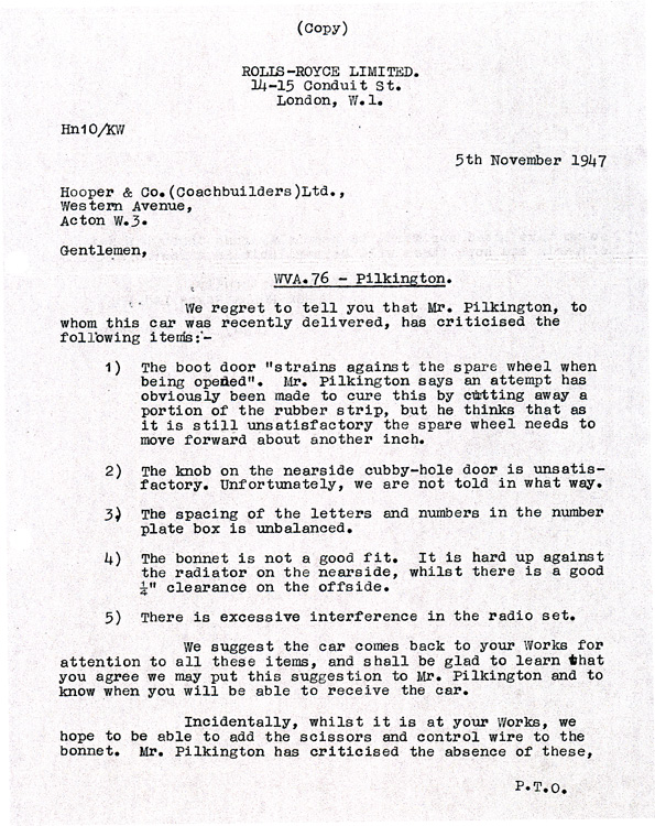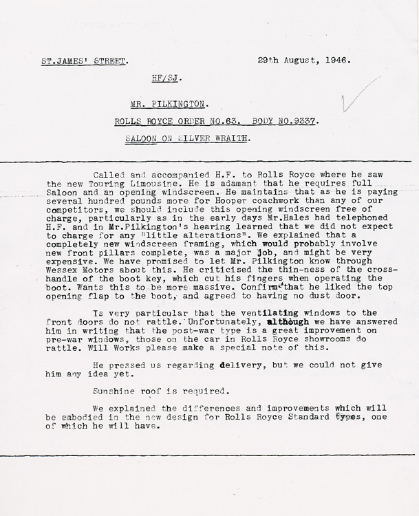 On this date, the chassis, WVA76, is delivered to Hooper to be mated with a touring limousine body for its owner Mr. J. Cohen. However, Hooper notifies Rolls-Royce, Ltd. that no touring limousines will be available until the middle of September. Rolls-Royce decided to re-assign this chassis to order 5324, a Saloon without division for a Mr. Pilkington who was not scheduled to have his chassis delivered to Hooper until February of 1948, see letter dated 11 July, 1947.It is with interest we note that the first communication about this order was dated 21 August, 1946. Mr. Pilkington insisted that his new Rolls-Royce was fitted with an opening windscreen, just like his pre-war Wraith has. See letter 1 and letter 2.