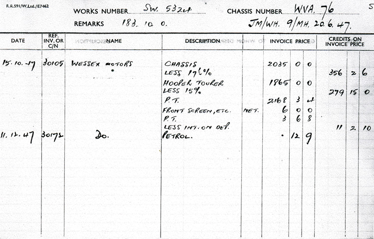 via Wessex Motors, Ltd. on New Street, Salisbury. Invoices indicate the 2035 pounds were paid for the chassis and 1,865 pounds were paid for the body, plus tax for a total of UK£6,068. This would be equivalent to US$259,000 in 2004.